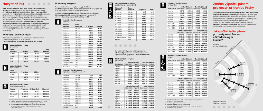 Od roku 2026 se Praha pro přeshraniční cesty bude počítat jako 3 tarifní pásma místo dosavadních čtyř. Pásmo P se nově bude počítat pouze jako jedno pásmo (původně jako dvě pásma). Například cesta z 1. vnějšího pásma do centra Prahy (pásmo P) nově vyžadovat pouze jízdenku pro 4 pásem (pásma P, 0, B a 1) místo původně pětipásmové jízdenky. Pásma 0 a B zůstávají beze změny, pro výpočet ceny jízdného ze středočeského regionu do těchto pásem se tak nic nemění.