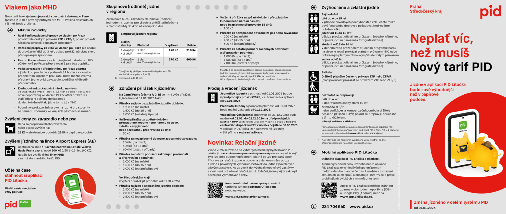 - Rozšíření přepravy za 0 Kč ve vlacích po Praze pro osobu doprovázející dítě do 3 let, pokud prokáže nárok na slevu předepsaným způsobem.