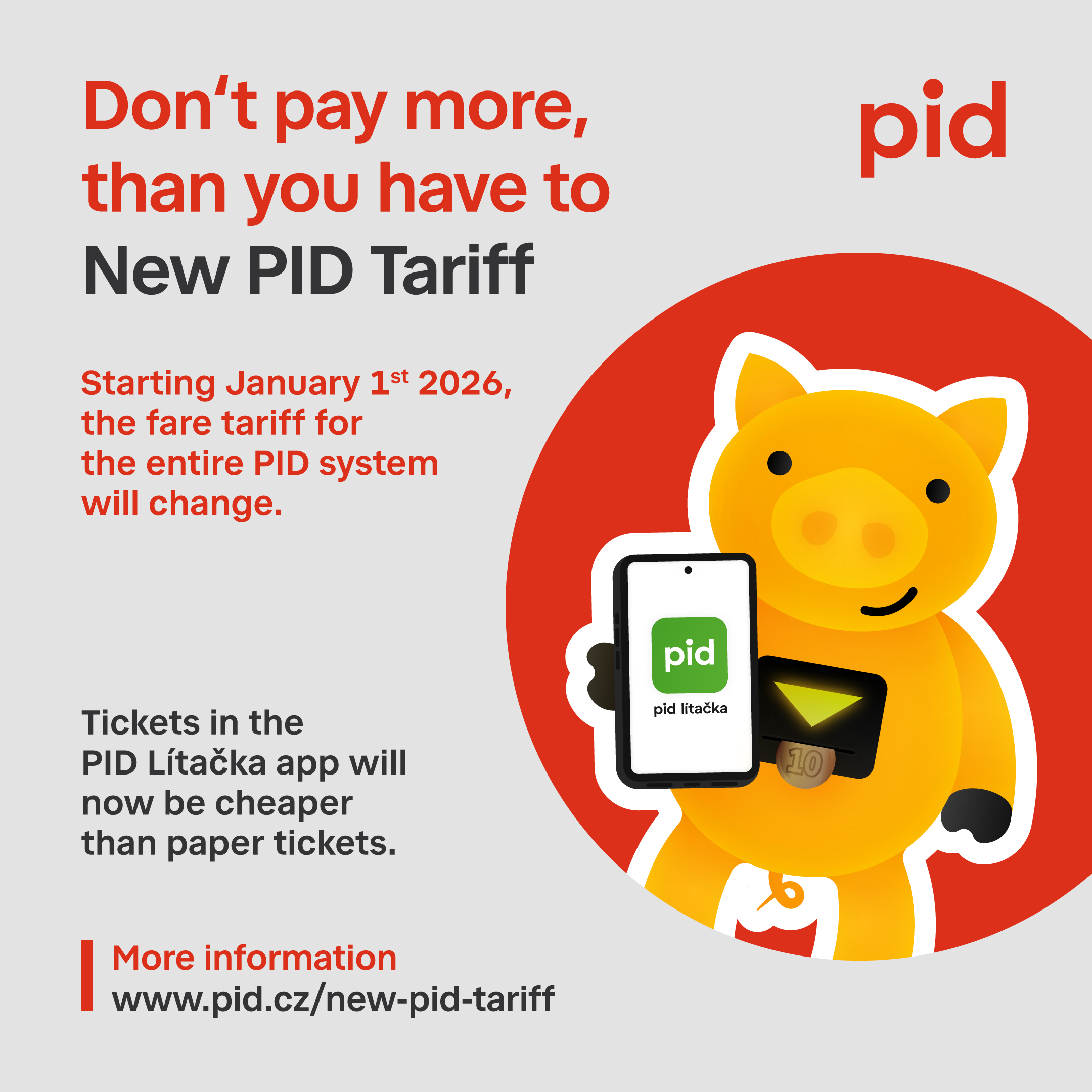 From 1 January 2026, a new Prague Integrated Transport (PID) tariff will come into effect. The changes will mainly affect fare prices – there will be an increase in the price of single journey tickets in Prague and the outer zones, and also in the price of season tickets in the outer tariff zones. The price of season tickets within Prague will remain unchanged.