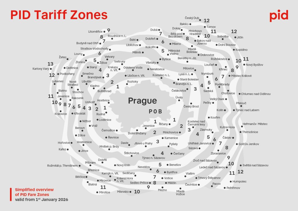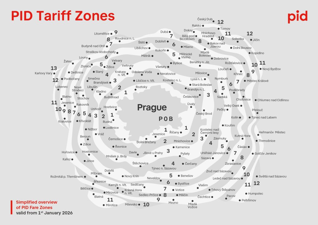 Prague integrated transport is divided into individual tariff zones for the purposes of the PID Tariff. In Prague there are tariff zones P, 0 and B, in the Central Bohemia Region (hereinafter also referred to as “Region”) the tariff zones are numbered from 1 upwards and form a concentric imaginary “intermediate ring” around Prague.