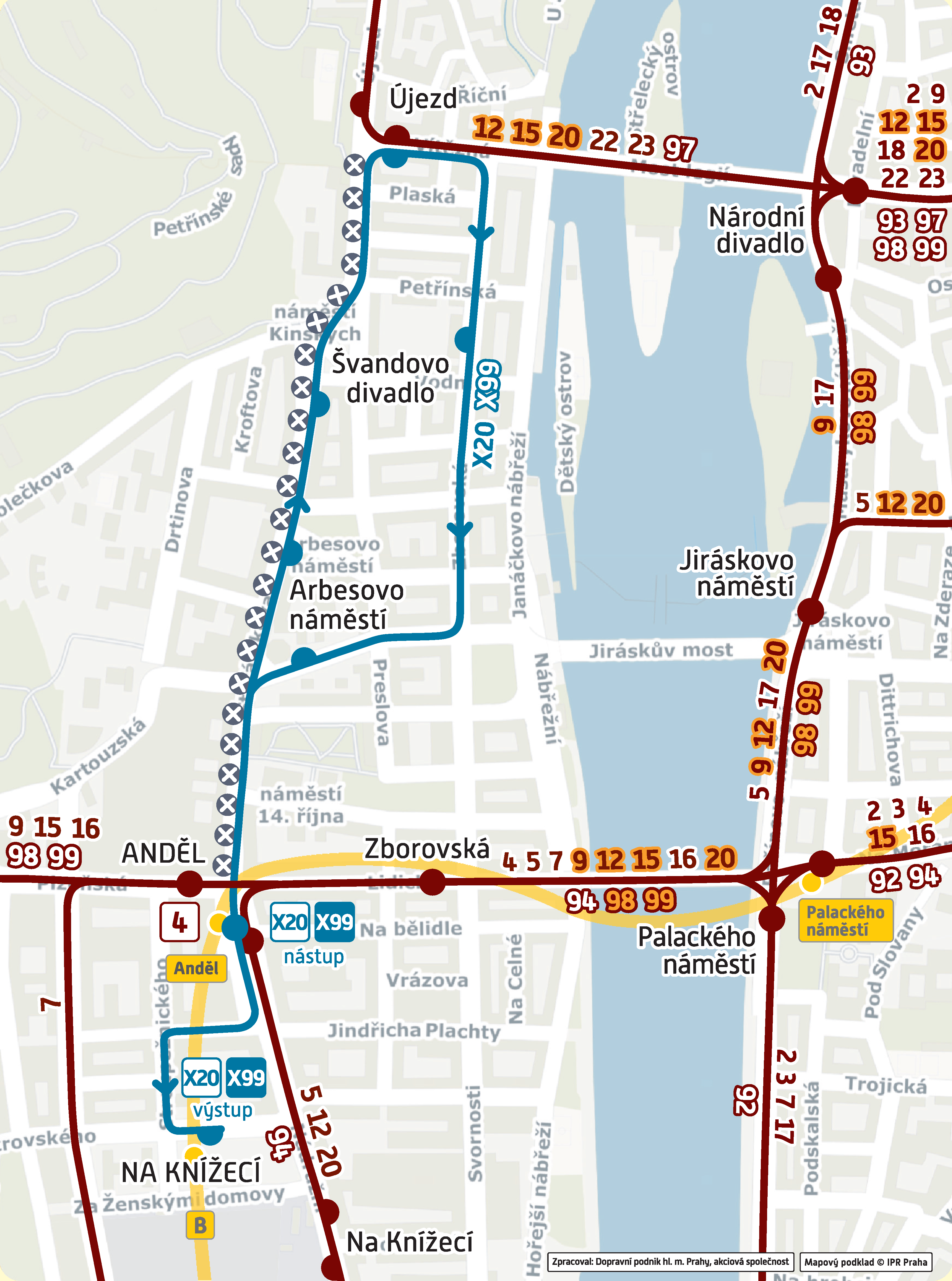 Zavedena je náhradní autobusová doprava X20 (v denním provozu) a X99 (v nočním provozu) v trase Anděl – Arbesovo náměstí – Švandovo divadlo – Újezd – Švandovo divadlo – Arbesovo náměstí – Anděl – Na Knížecí.