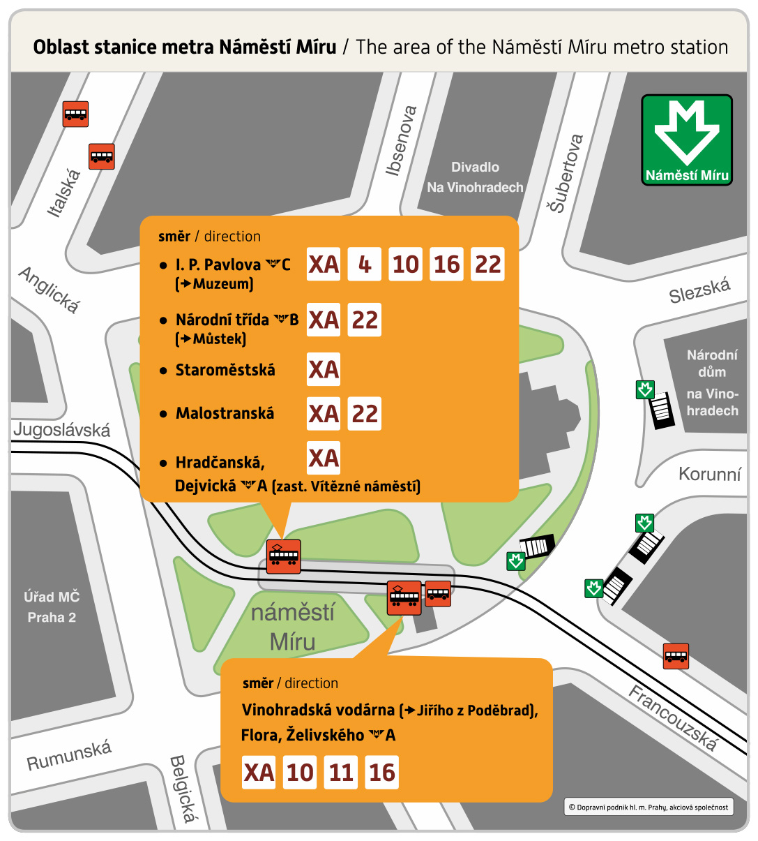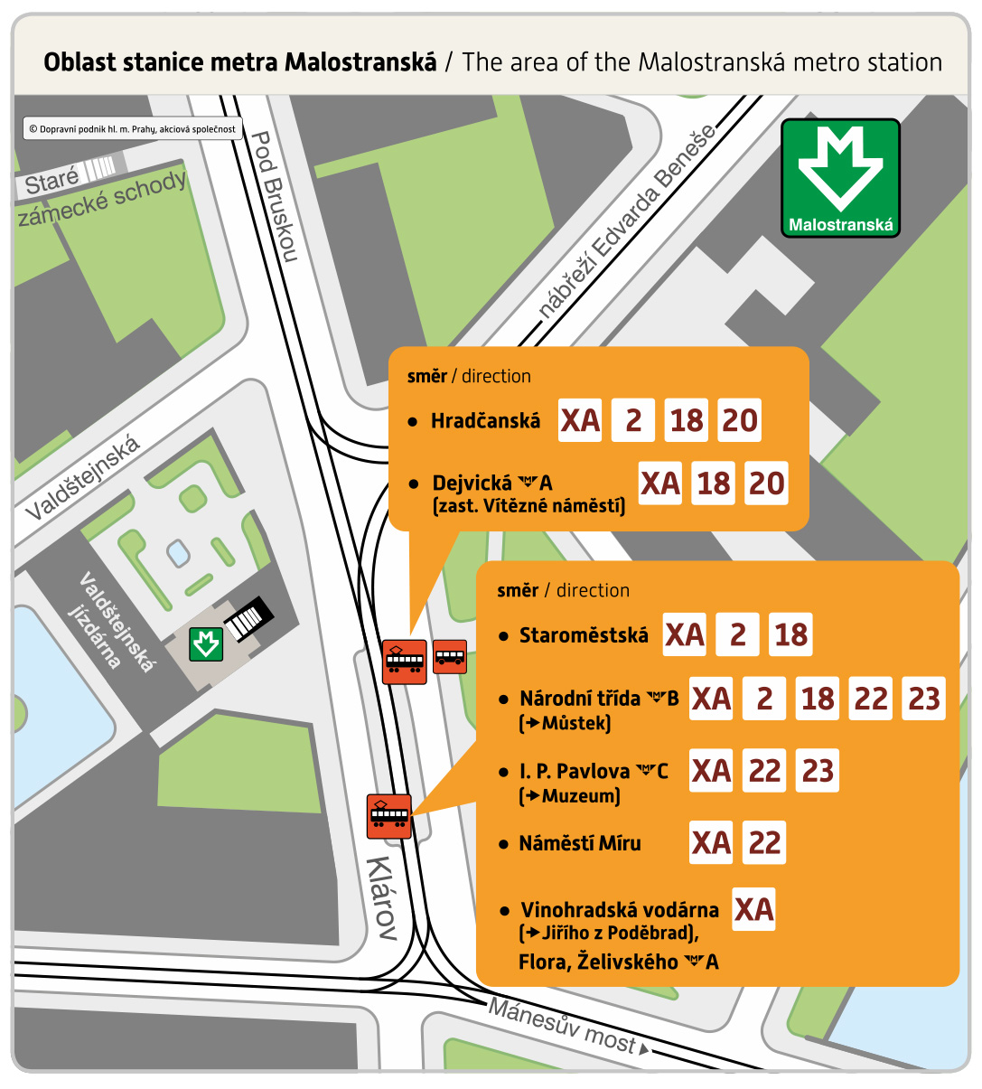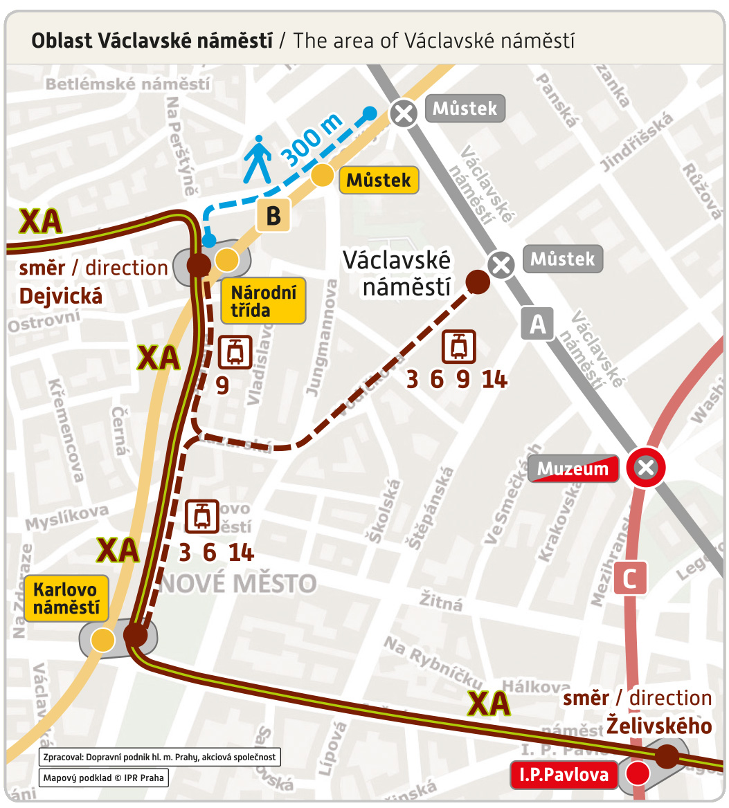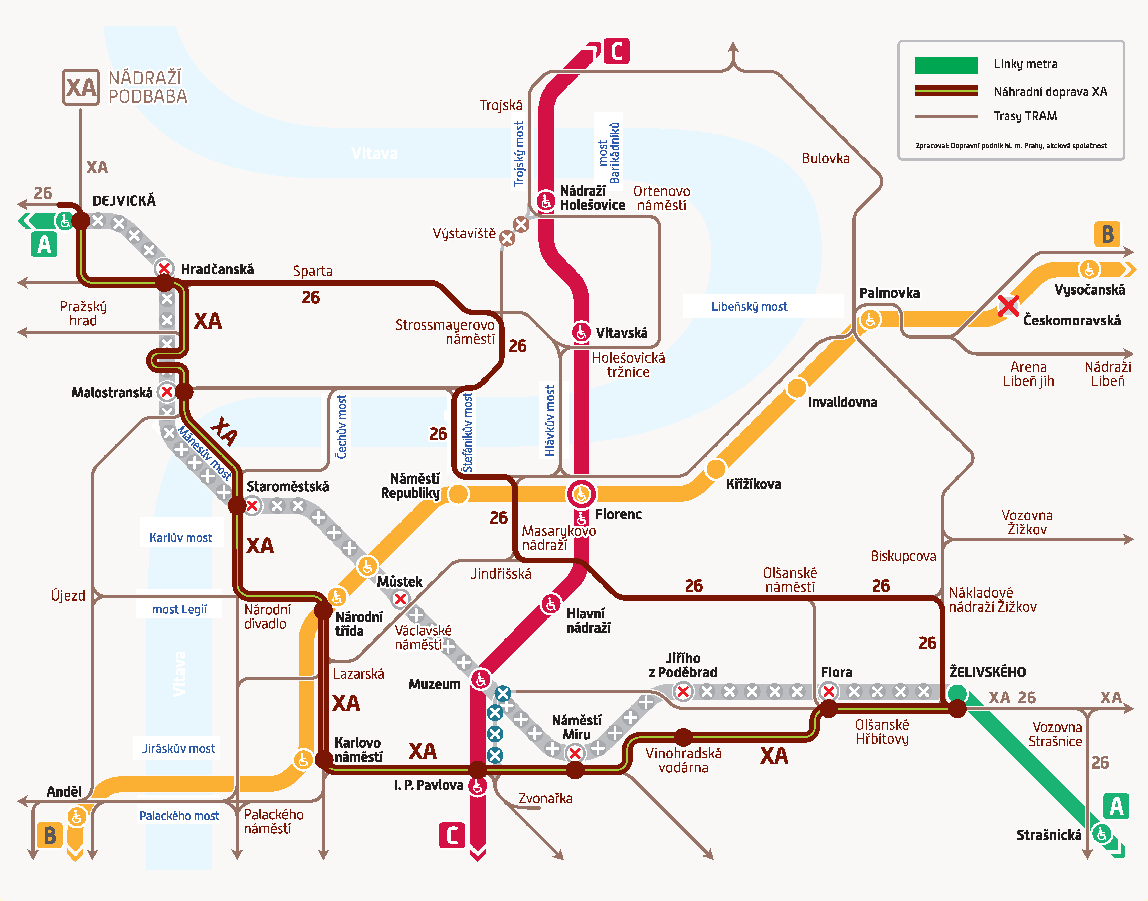 - V denním provozu je zavedena náhradní tramvajová doprava XA v trase NÁDRAŽÍ PODBABA – Vítězné náměstí – Hradčanská – Malostranská – Staroměstská – Národní třída – Karlovo náměstí – I. P. Pavlova – Náměstí Míru – Vinohradská vodárna – Flora – Želivského – NOVÉ STRAŠNICE.