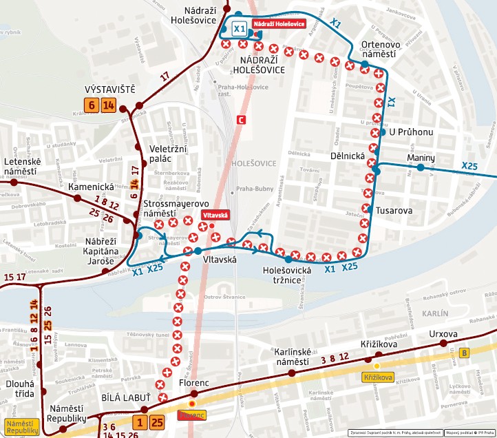 - Linka náhradní autobusové dopravy X25 je prodloužena do trasy PALMOVKA – Dělnická – Vltavská – STROSSMAYEROVO NÁMĚSTÍ.