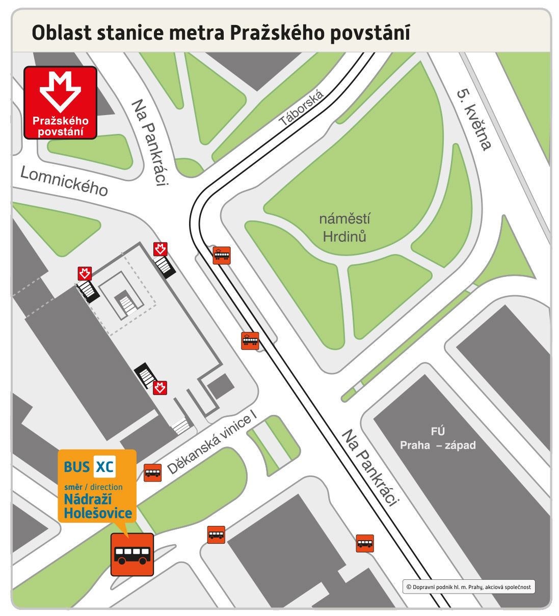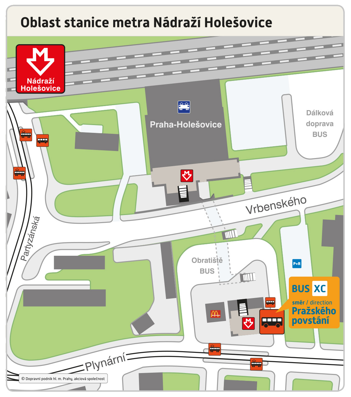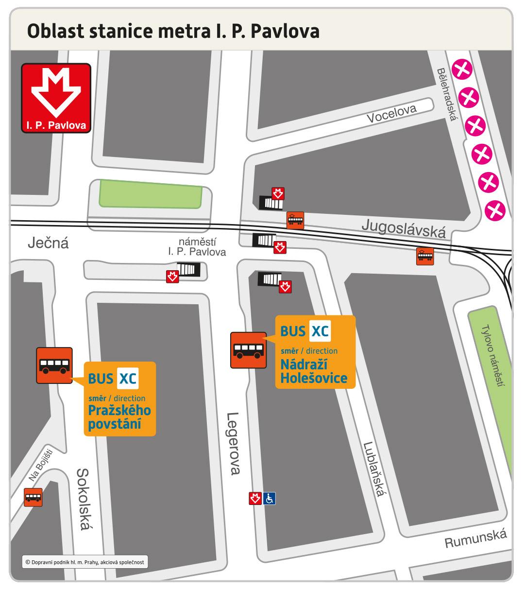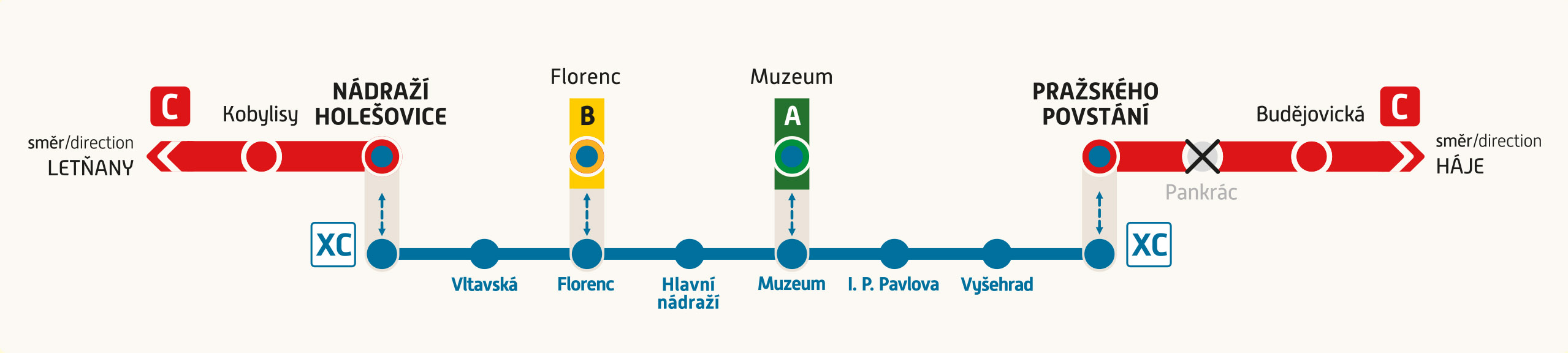 - V denním provozu je zavedena náhradní autobusová doprava XC v trase Nádraží Holešovice – Vltavská – Florenc – Hlavní nádraží – Muzeum – I. P. Pavlova – Vyšehrad – Pražského povstání.