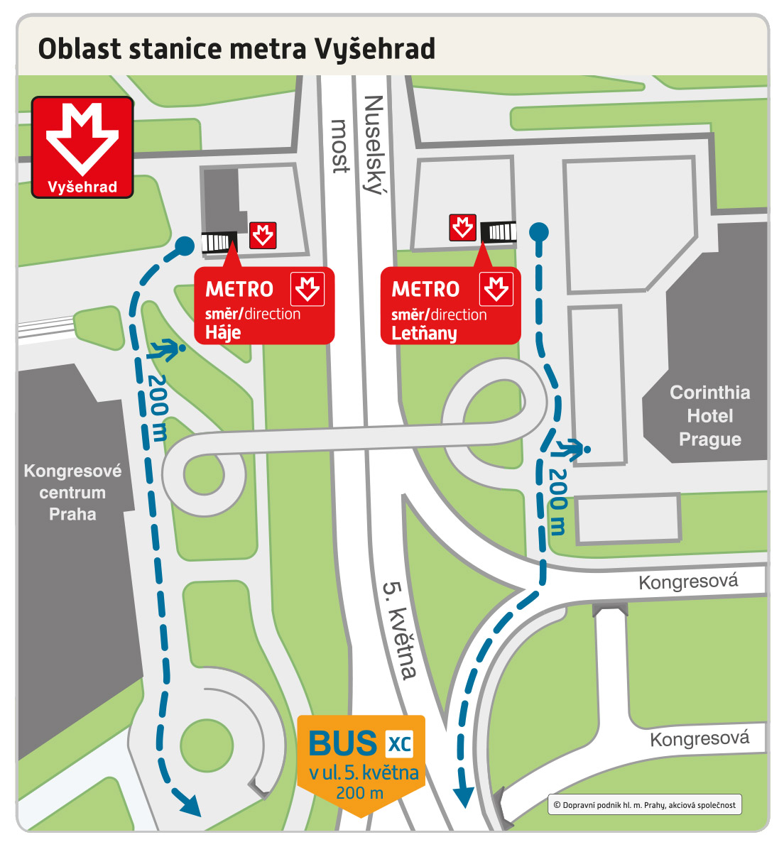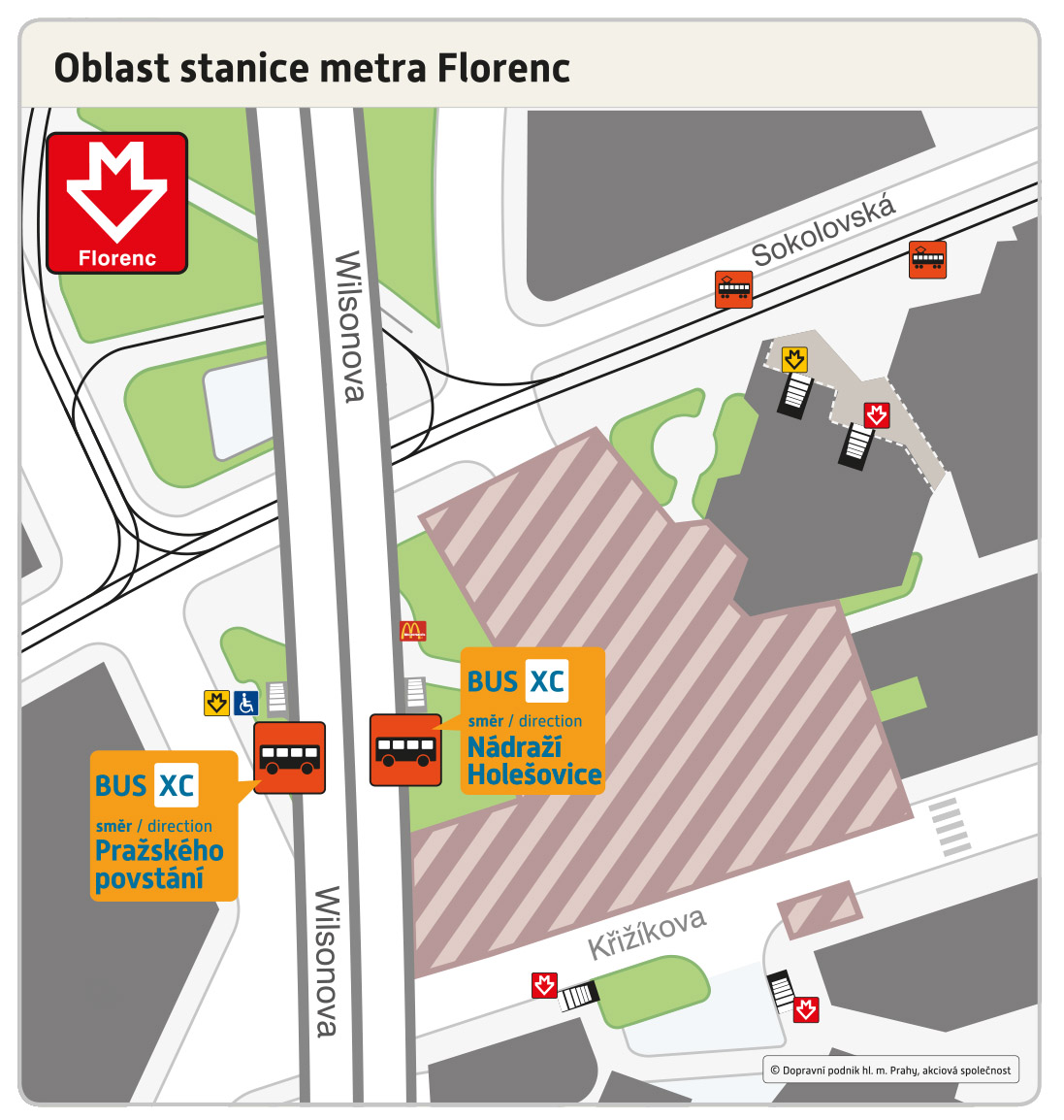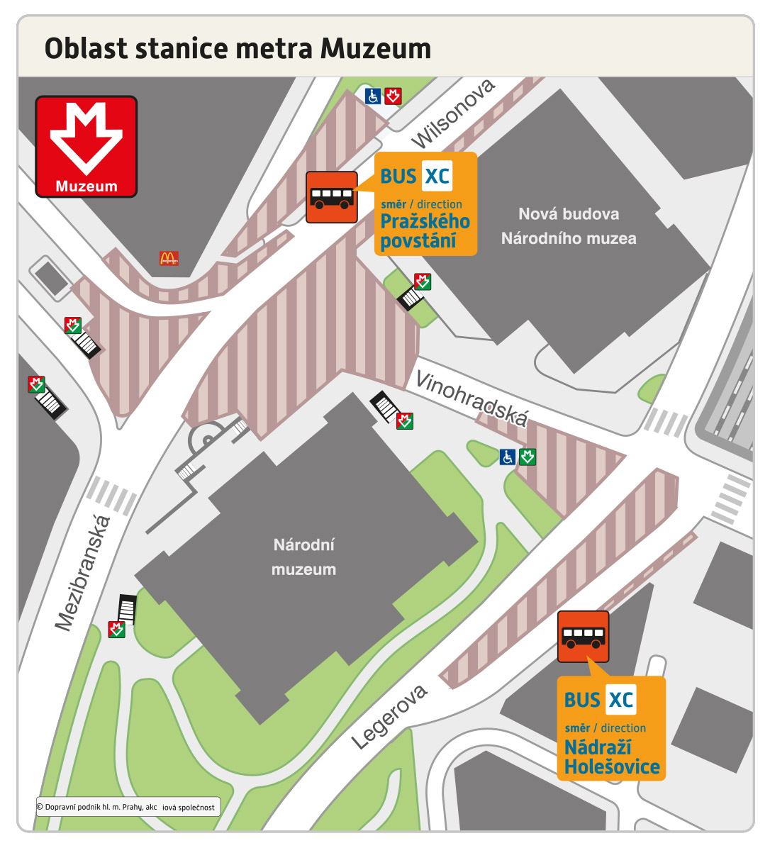 Upozorňujeme, že zastávky náhradní autobusové dopravy v přestupních uzlech Muzeum a Florenc jsou v delší docházkové vzdálenosti od nástupišť stanic metra: Muzeum cca 4-5 minut, Florenc cca 7-8 minut chůze. |