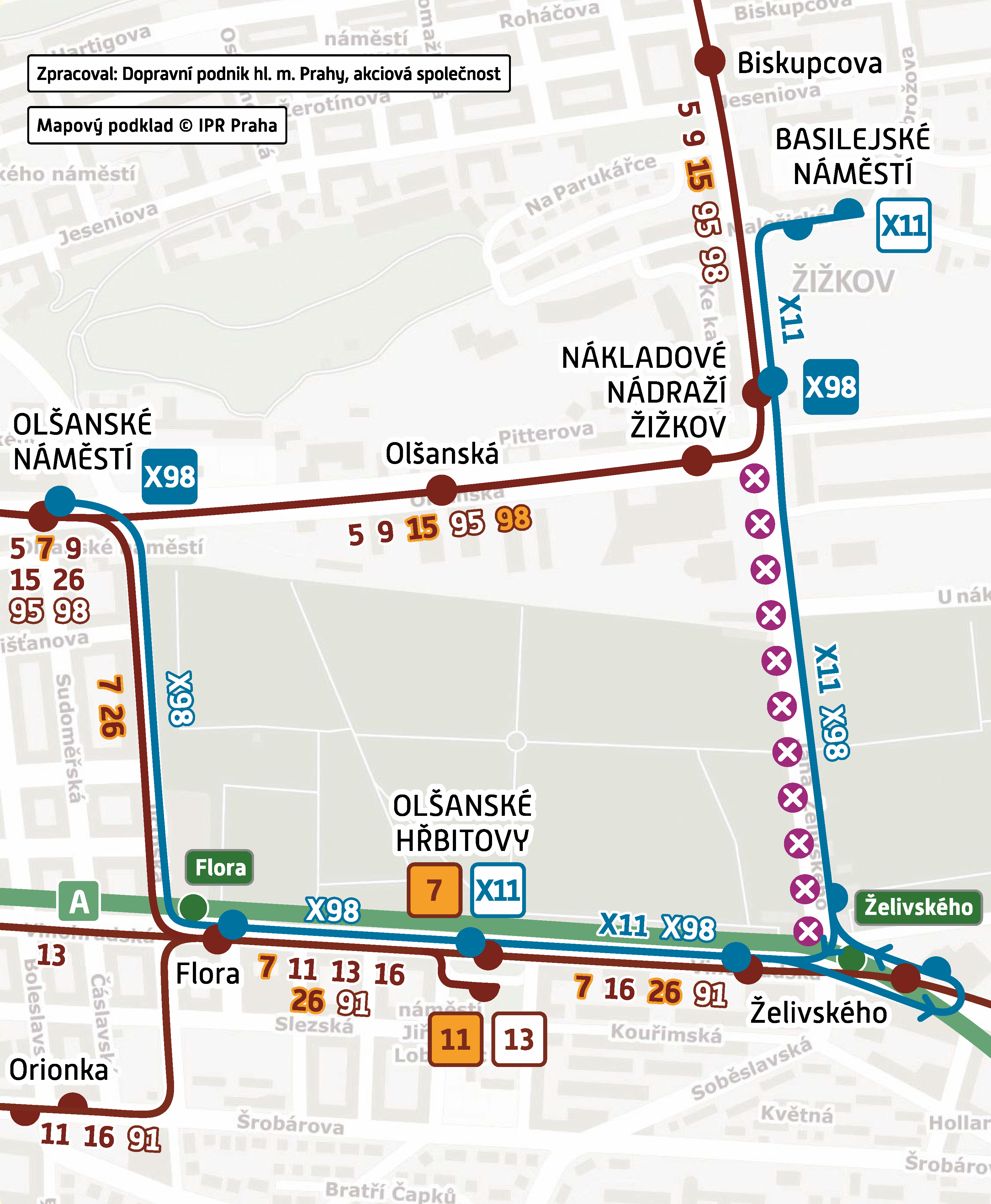 V nočním provozu je zavedena náhradní autobusová doprava X98 v trase Olšanské náměstí – Flora – Nákladové nádraží Žižkov.