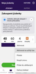 Důležitou volbou je nastavení aktivace (zahájení platnosti) jízdenky. V aplikaci máte tři možnosti řešení: