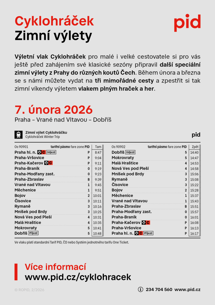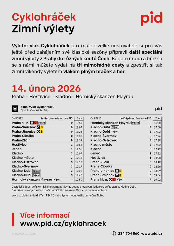 Po úspěchu čtyř sezón letních výletů, během nichž se Cyklohráček vydával i do míst, kam běžně nejezdí, přicházíme společně s dopravcem České dráhy, a. s. také s pokračováním v zimním kabátě. I v letošním roce proto připravujeme sérii mimořádných zimních jízd, které nabídnou netradiční trasy, zajímavé cíle a jedinečnou atmosféru zimních výletů vlakem.