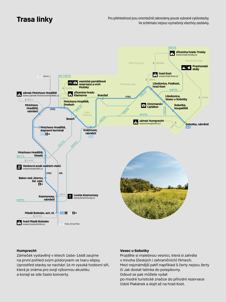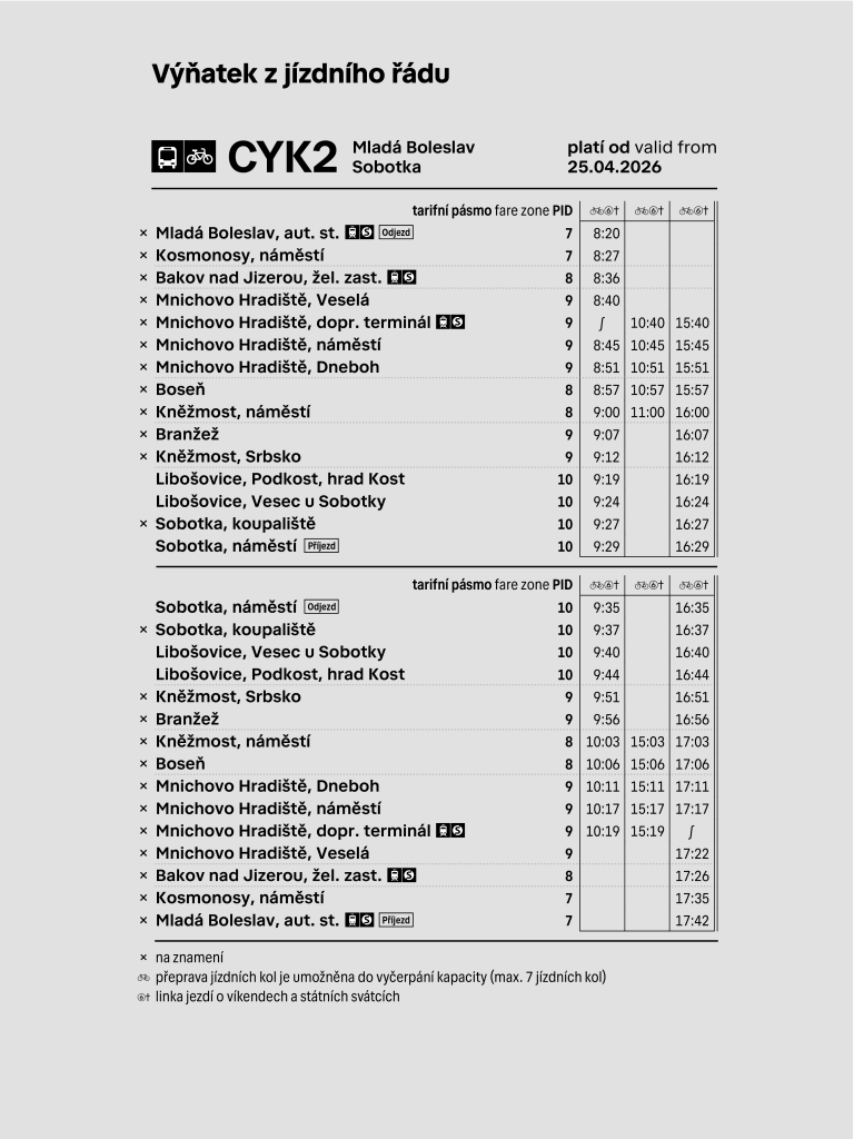 Českorájský cyklobus „CYK2“ se od 25. dubna 2026 přidá ke svým předskokanům. Vyrazí z Mladé Boleslavi přes Bakov nad Jizerou, Mnichovo Hradiště, hrad Valečov v Boseni, Kněžmost, Branžež a hrad Kost v Libošovicích do Sobotky. Celkem nabídne tři páry spojů, přičemž některé pojedou pouze v části trasy. V provozu bude až do konce září.