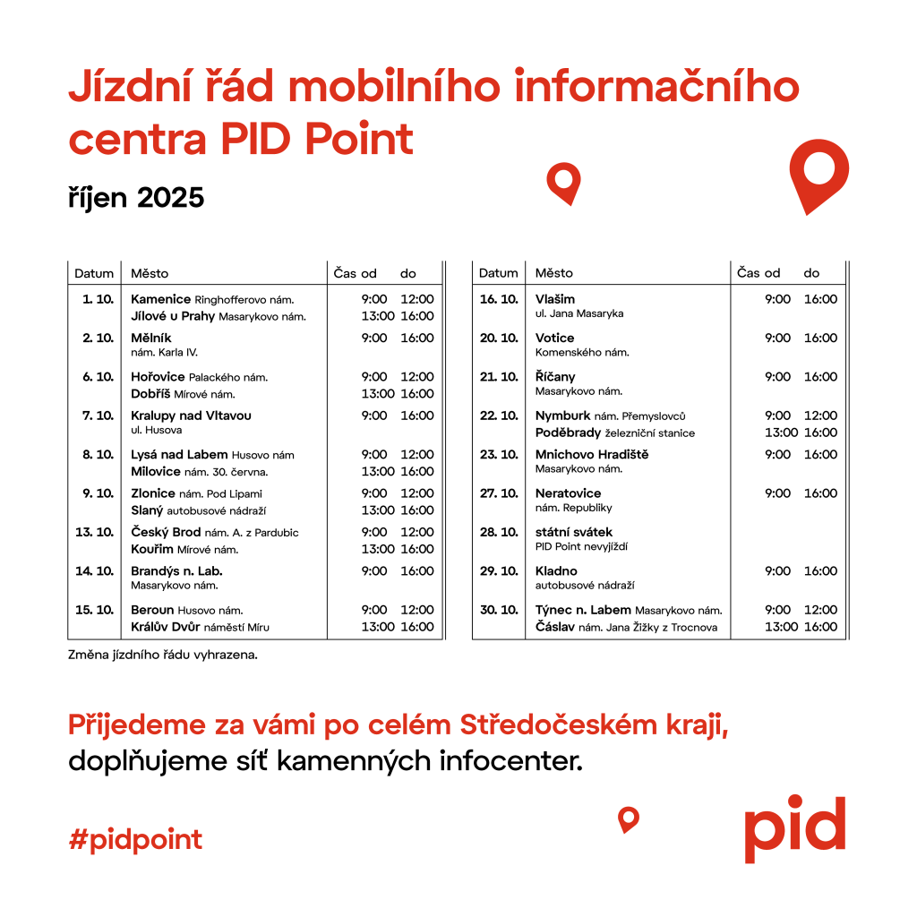 „Harmonogram jízd PID Pointu bude vždy dopředu naplánován zhruba do patnáctého dne předchozího měsíce. Termíny budou dostupné široké veřejnosti na našich webových stránkách www.idsk.cz a také na sociálních sítích PID. Prvním místem, kde bude PID Point občanům k dispozici, bude 1. září na Masarykově náměstí v Jílovém u Prahy,“ konstatuje Zdeněk Šponar, ředitel IDSK.