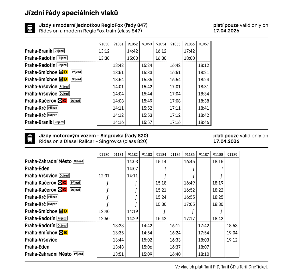 V Dobřichovicích je zajištěna návaznost na vlaky S7 od Prahy i Berouna. Kapacita speciálního autobusu s přívěsem je 25 jízdních kol. Cena za přepravu kola je 23 Kč v aplikaci, resp. 25 Kč u řidiče. V jízdních řádech PID ho najdete pod označením „CYK 1“ a v provozu bude až do 1. listopadu 2026.