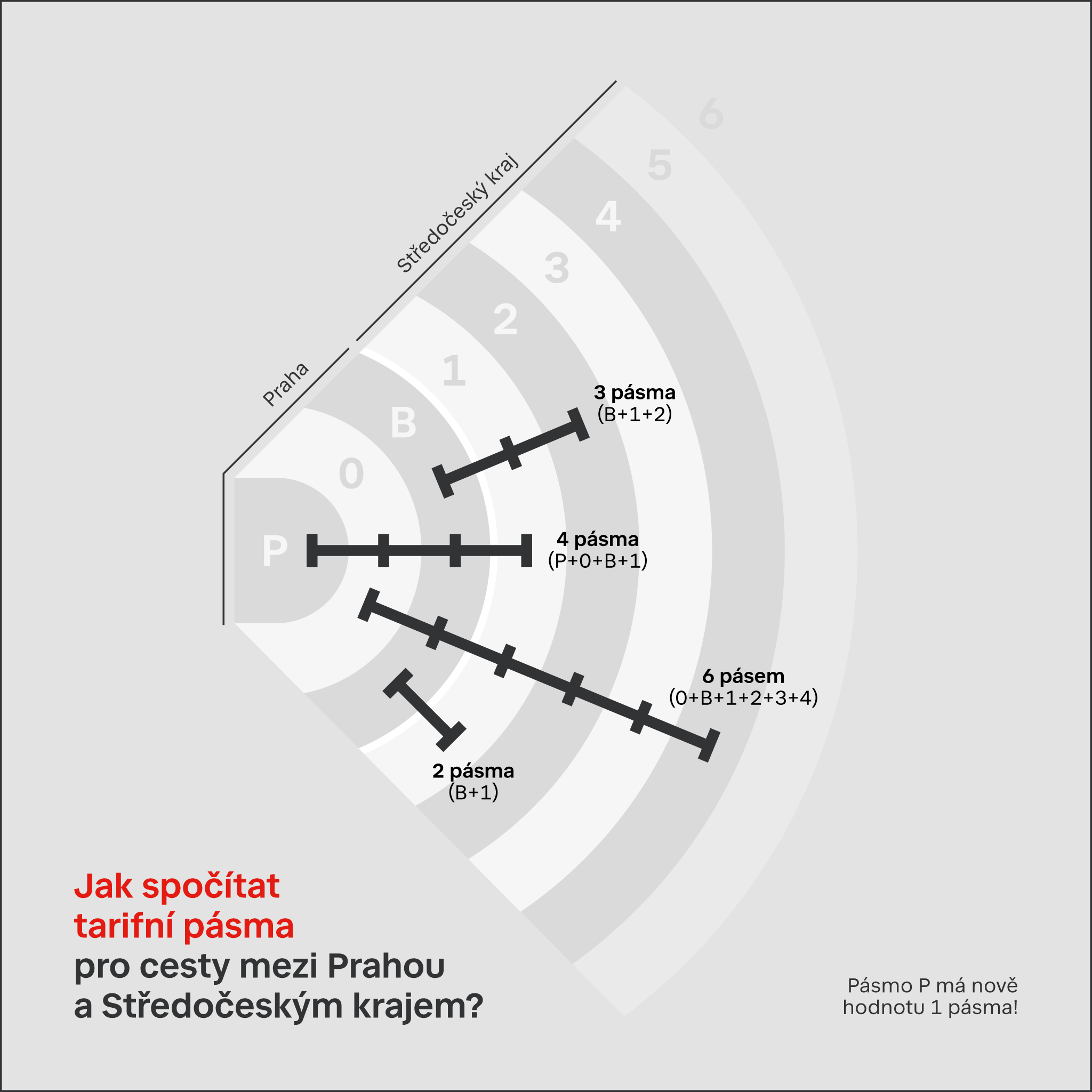 Od roku 2026 se Praha pro přeshraniční cesty bude počítat jako 3 tarifní pásma místo dosavadních čtyř. Pásmo P se nově bude počítat pouze jako jedno pásmo (původně jako dvě pásma). Například cesta z centra Prahy (pásmo P) do 1. vnějšího pásma bude nově vyžadovat pouze jízdenku pro 4 pásem (pásma P, 0, B a 1) místo původně pětipásmové jízdenky.