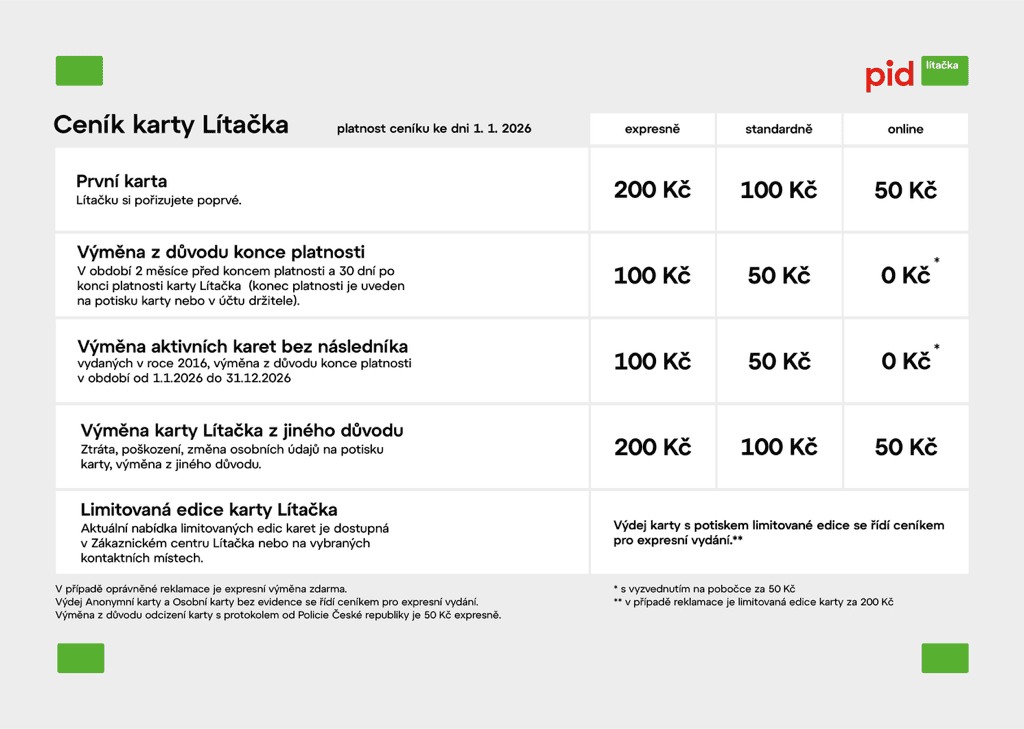 Karty Lítačka vydané v roce 2016 byly v uplynulých letech několikrát automaticky prodlouženy. V roce 2026 však již žádné další prodloužení neproběhne. Karty vydané v roce 2016 zůstávají v platnosti do data uvedeného v systému. Výměnu za novou kartu je možné provést kdykoli během roku 2026. Výměnu můžete provést online přes e-shop Lítačky nebo osobně ve Škodově paláci a na vybraných kontaktních místech. Seznam kontaktních míst a rozsah poskytovaných činností je uveden na webu.