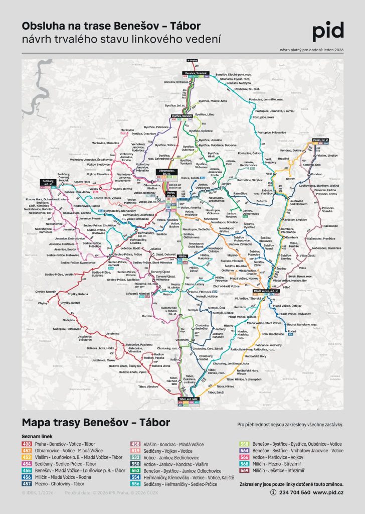Páteřní linka 401 bude přečíslována na novou linku 408, která pojede z Prahy do Votic v současné trase. Z Votic dále bude pokračovat přes Arnoštovice a Heřmaničky do Sedlece-Prčic, odkud bude trasována přes Chyšky, Jistebnici a Nadějkov do Tábora (po trase současné lince 454). Díky této úpravě trasy budou mít obce v úseku Votice – Tábor nové přímé spojení s Prahou a Benešovem.