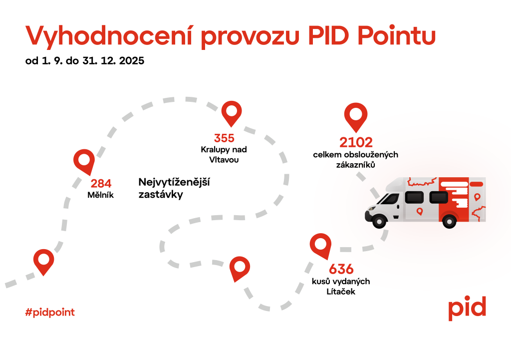 Mobilní informační centrum PID Point umožňuje obyvatelům a návštěvníkům měst a obcí ve Středočeském kraji od září loňského roku snáze si zakoupit předplatné jízdné, pořídit kartu PID Lítačka nebo získat informace o cestování ve veřejné hromadné dopravě v rámci systému PID, a to vše zcela zdarma. Za první 4 měsíce provozu navštívil PID Point už 25 různých míst ve Středočeském kraji a obsloužil přes 2 tisíce zákazníků a jednoznačně vede ve vydávání nových čipových karet Lítačka. Speciálně upravený automobil ujel za tu dobu už přes 7 tisíc km.