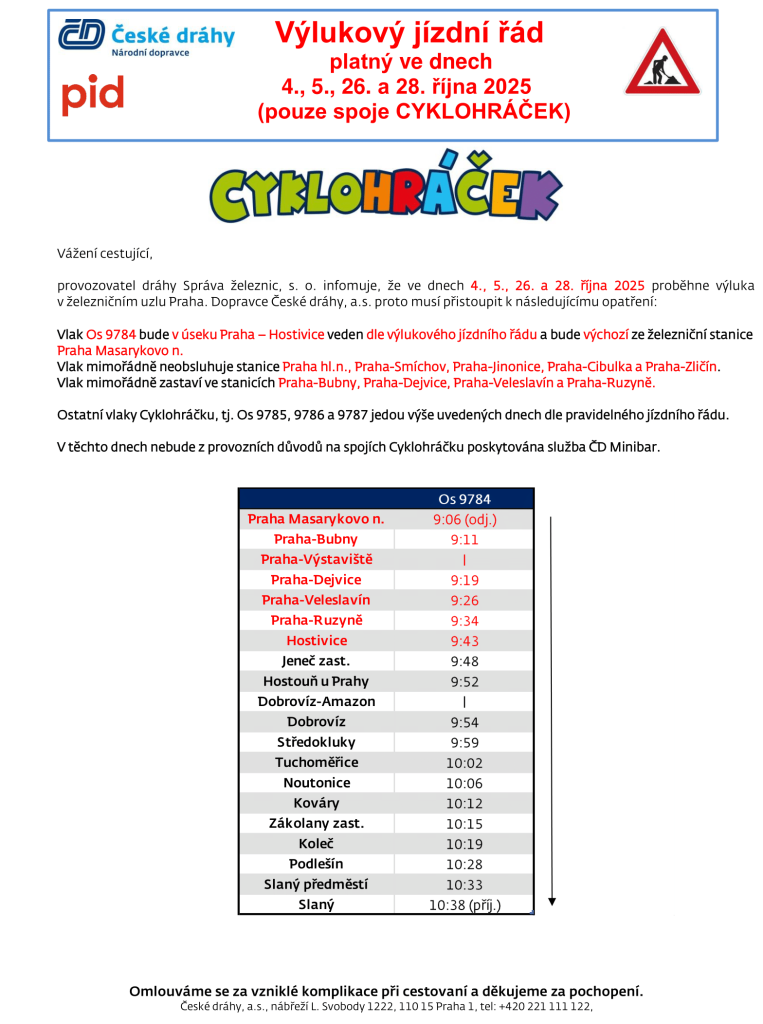 Upozorňujeme cestující, že původně plánovaná jízda Cyklohráčku do železniční stanice Zlonice dne 28. října 2025 (úterý) se nekoná a odpolední Os 9786 z Prahy tak bude ukončen ve stanici Slaný a odpolední vlak Os 9787 bude výchozí ze stanice Slaný do Prahy.