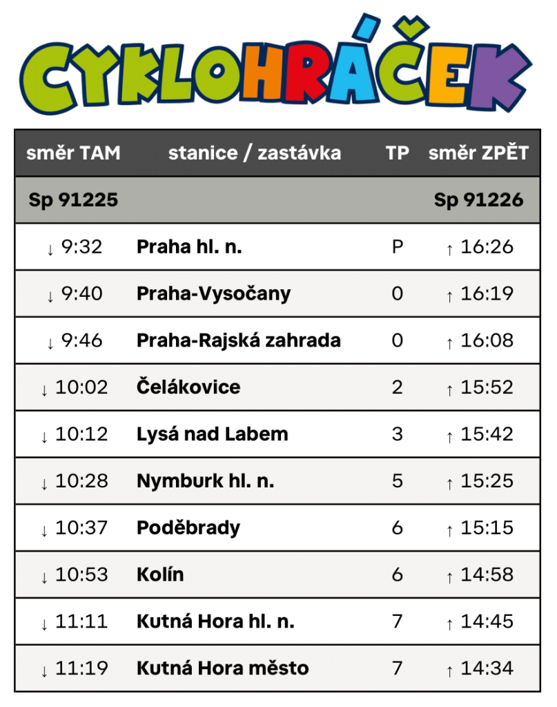 Na první zimní výlet se Cyklohráček vydá z Prahy do středočeské Kutné Hory. Jízdenky lze zakoupit prostřednictvím aplikace PID Lítačka (Tarif PID), aplikace Můj vlak (Tarif ČD) nebo na kterékoliv pokladně Českých drah. Součástí výletu je nabídka občerstvení prostřednictvím služby ČD Minibar přímo na palubě vlaku.