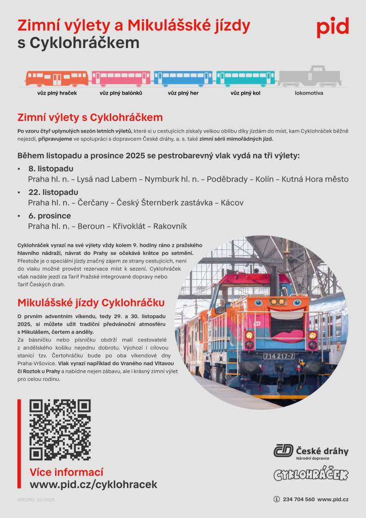 Po vzoru čtyř uplynulých sezón letních výletů, které si u cestujících získaly velkou oblibu díky jízdám do míst, kam Cyklohráček běžně nejezdí, připravujeme ve spolupráci s dopravcem České dráhy, a. s. také zimní sérii mimořádných jízd.