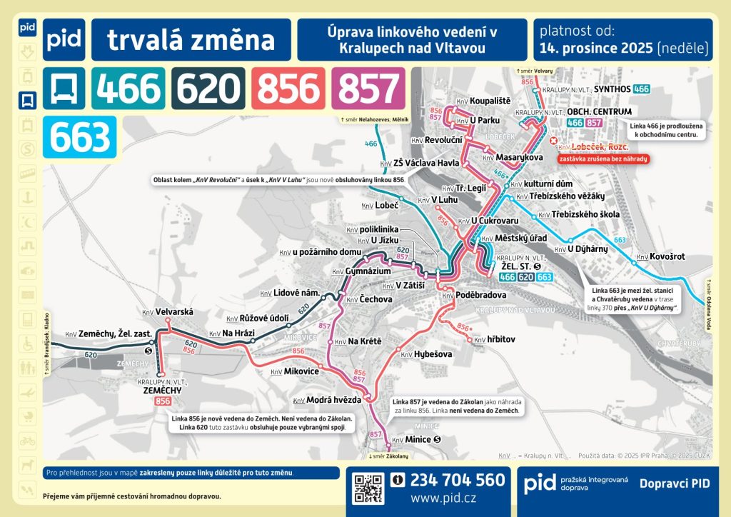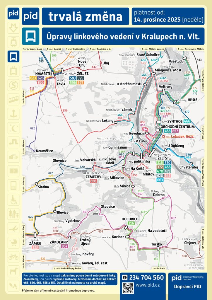 Od 14. prosince 2025 dojde v oblasti Kralupska ke změnám a optimalizaci jízdních řádů na několika linkách. Změny vychází zejména z dlouhodobých připomínek měst a obcí a na základě obdržených připomínek od cestujících. Cílem změny dopravního řešení je také zlepšit proklad a koordinaci jednotlivých linek, čímž dojde k rozšíření nabídky dopravní spojení pro řadu cestujících.