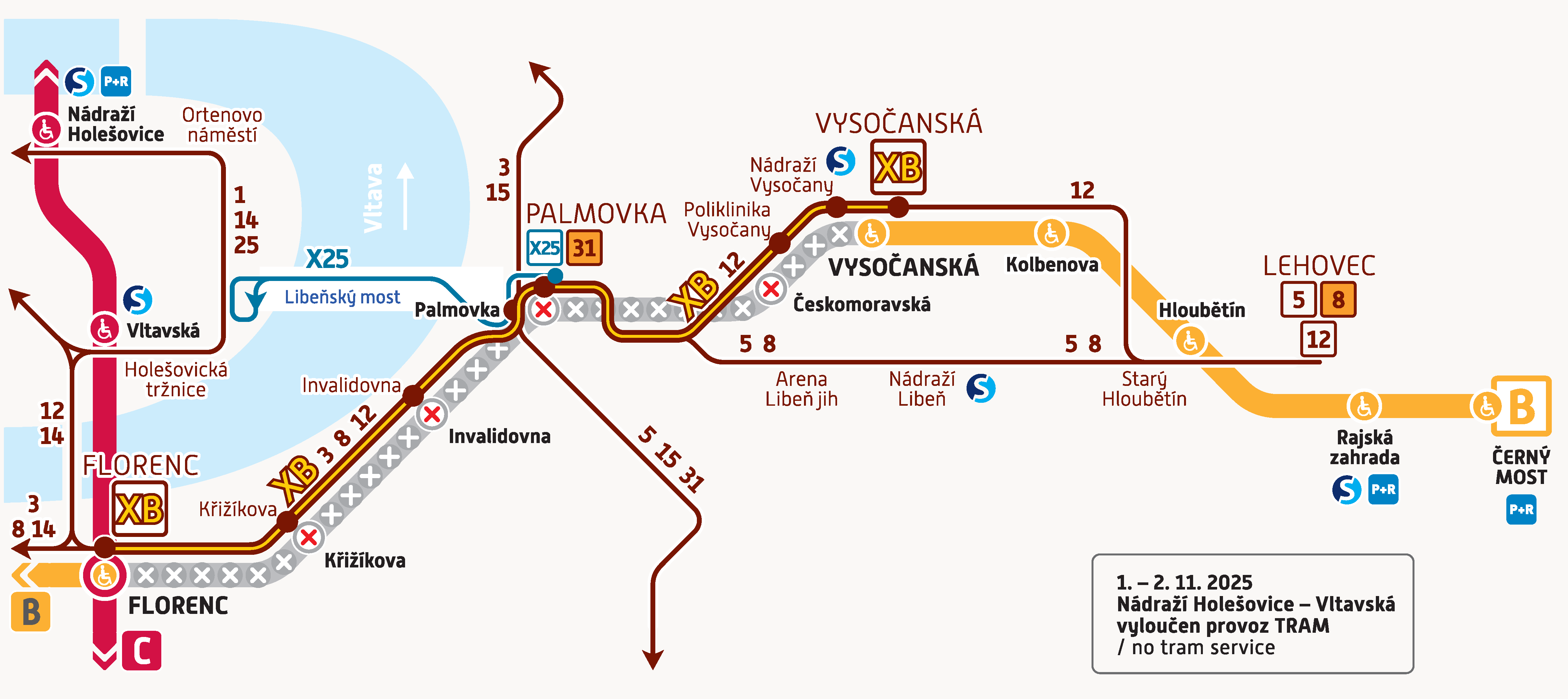 - Jako alternativní náhradní dopravu (mezi stanicemi Florenc a Palmovka) lze využít pravidelné tramvajové linky číslo 3 a 8.
