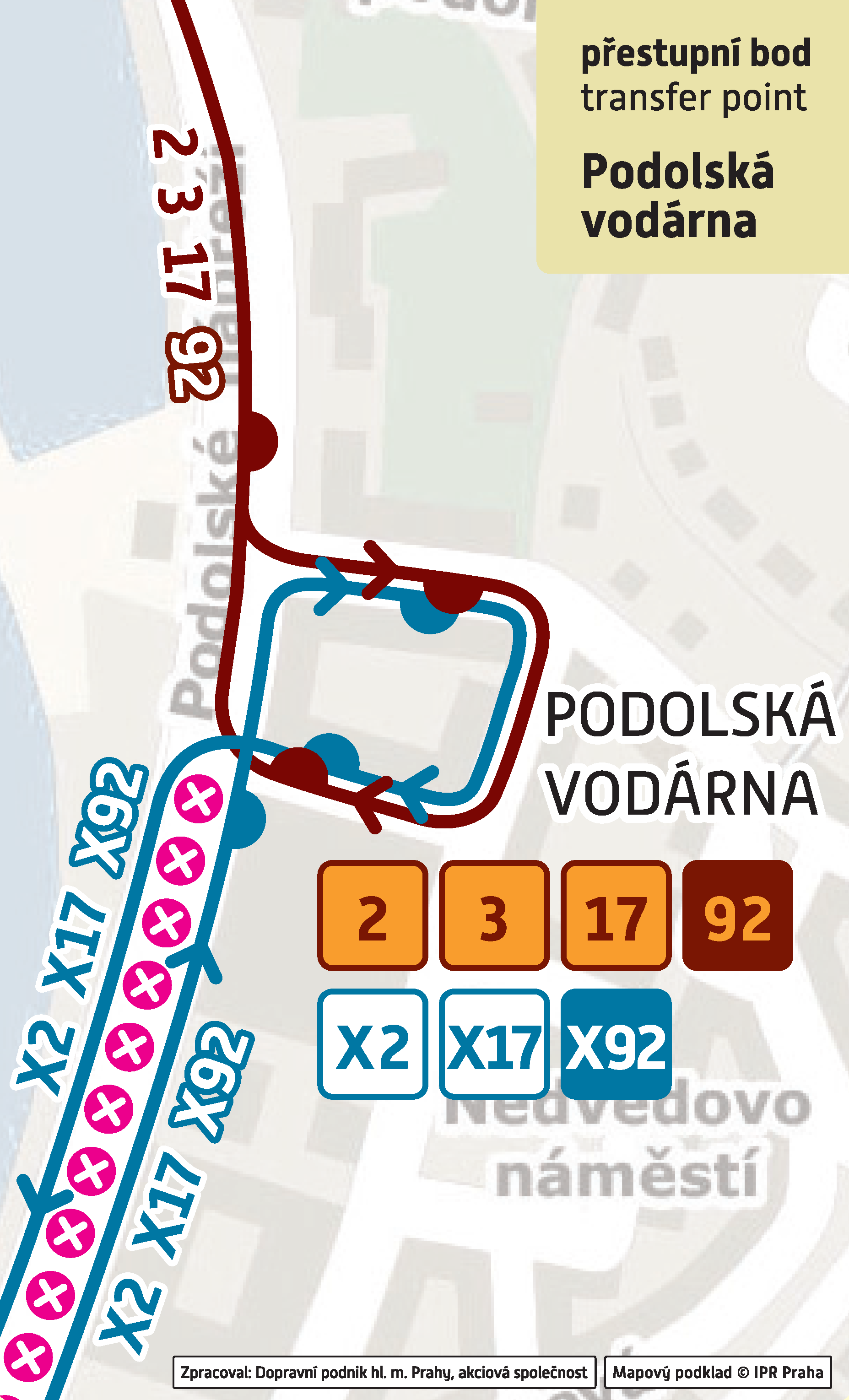 - Zastávky linek náhradní autobusové dopravy X2 směr Podolská vodárna
