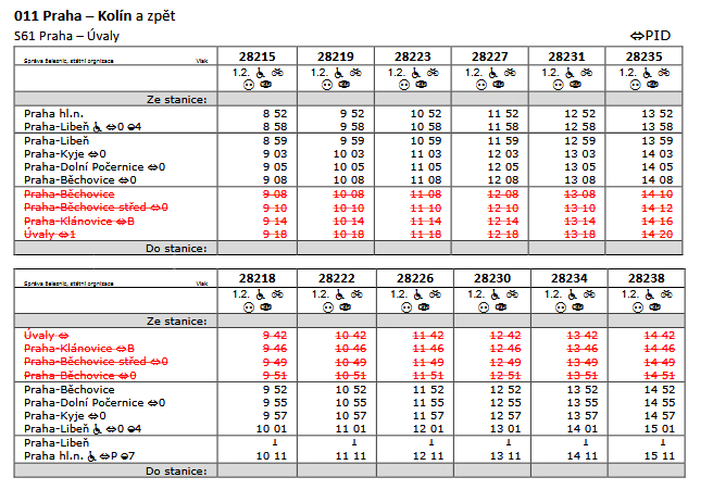- Vlaky pravidelně vyjíždějící od 8:52 do 14:42 jsou v úseku Praha-Běchovice – Úvaly odřeknuty bez náhrady, neobsluhují stanice a zastávku Praha-Běchovice střed, Praha-Klánovice a Úvaly.