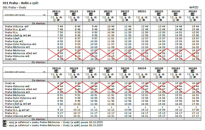 • Vlaky pravidelně vyjíždějící od 12:44 do 16:40 jsou v úseku Praha-Běchovice – Úvaly odřeknuty bez náhrady, neobsluhují stanice a zastávku Praha-Běchovice střed, Praha-Klánovice a Úvaly.