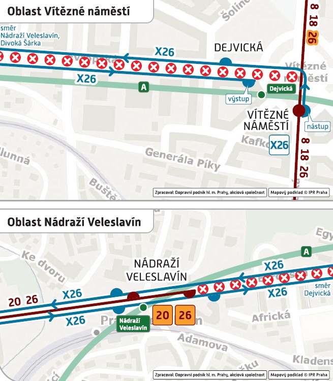 V trase Vítězné náměstí – Dejvická – Bořislavka – Nádraží Veleslavín – Divoká Šárka je zavedena náhradní autobusová doprava číslo X26.