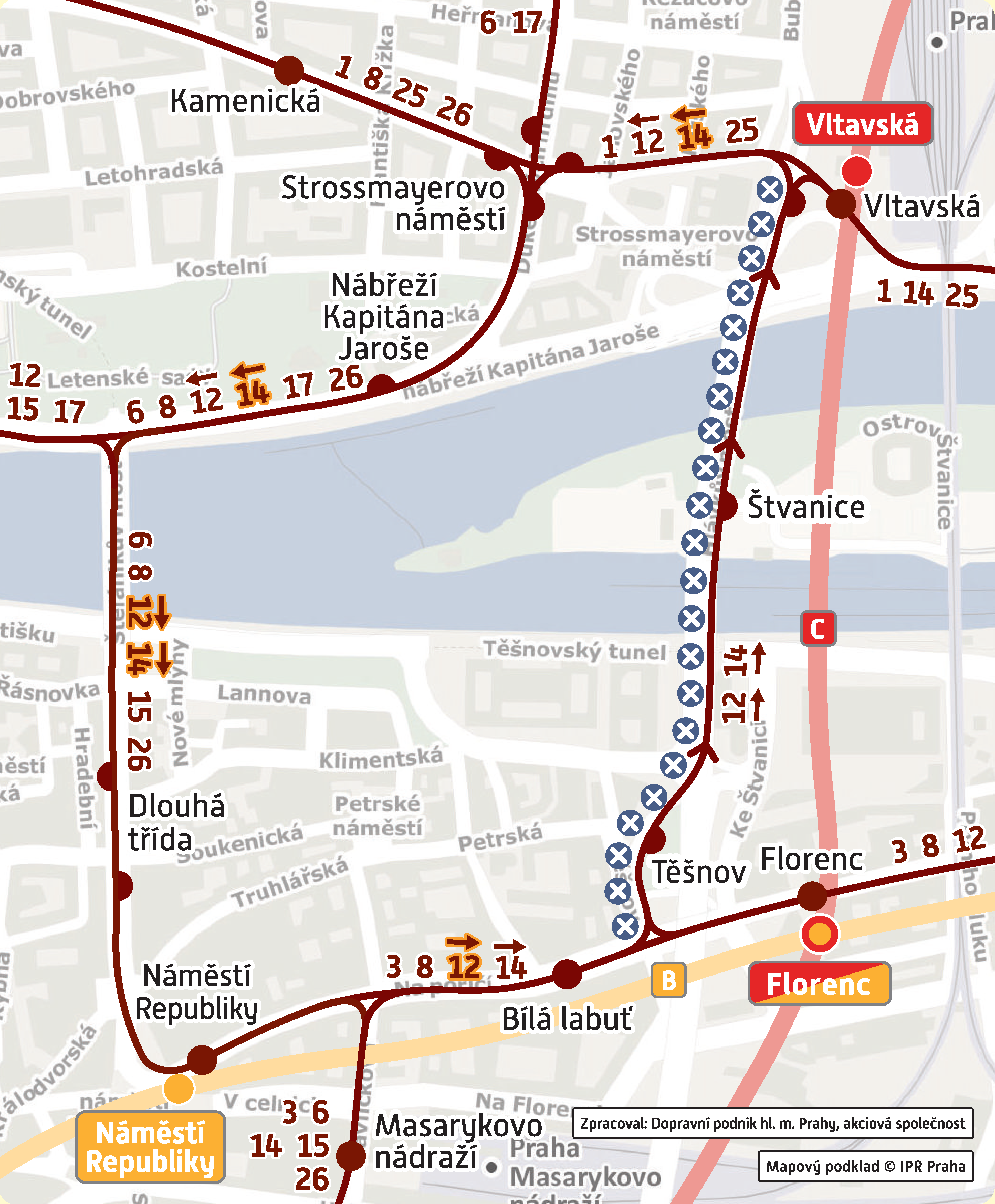 - Do zastávek Těšnov a Štvanice lze využít spoje tramvajových linek číslo 12 a 14 v opačném směru.