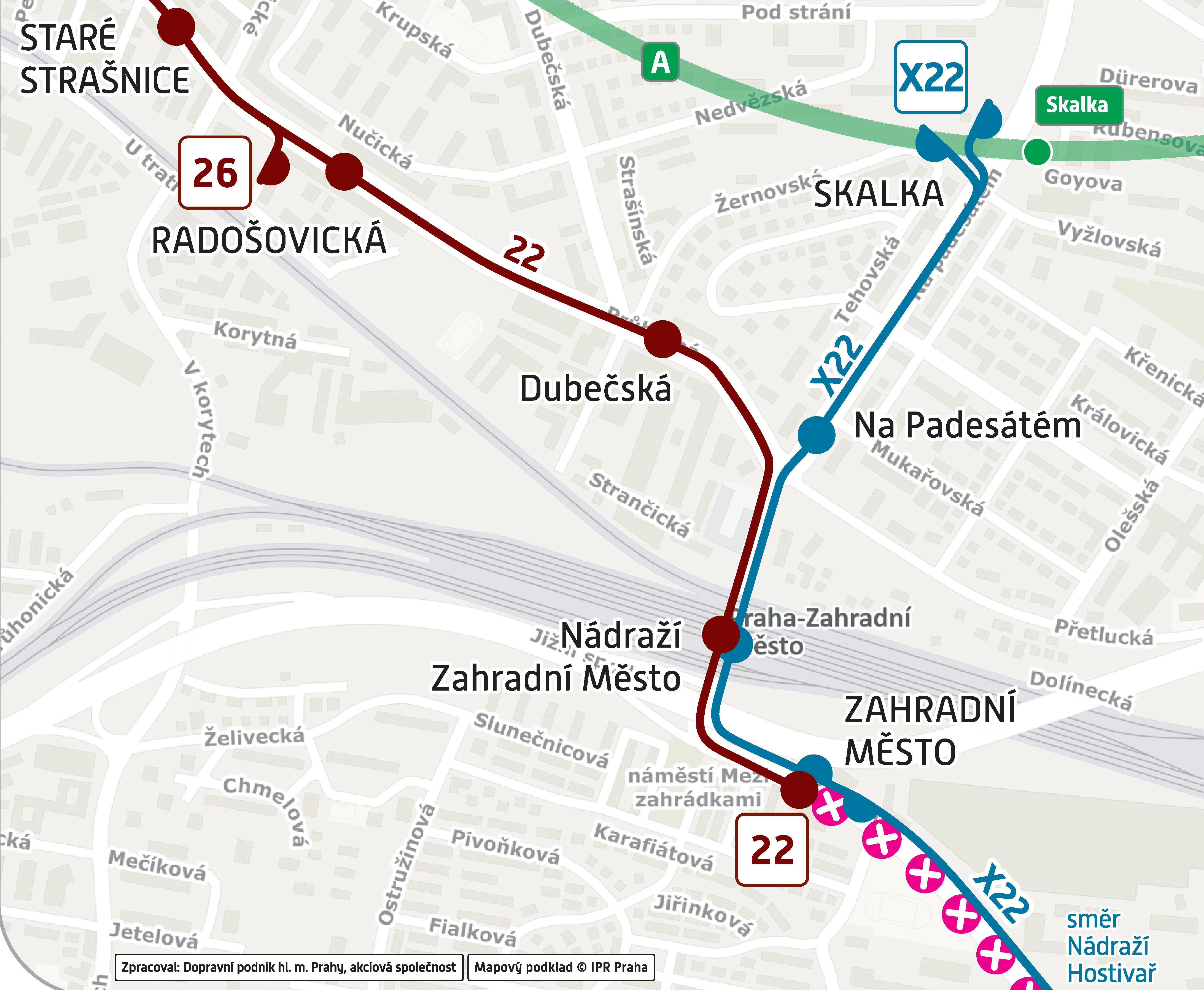 V trase Skalka – Nádraží Zahradní Město – Zahradní Město – Nádraží Hostivař je zavedena náhradní autobusová doprava číslo X22.